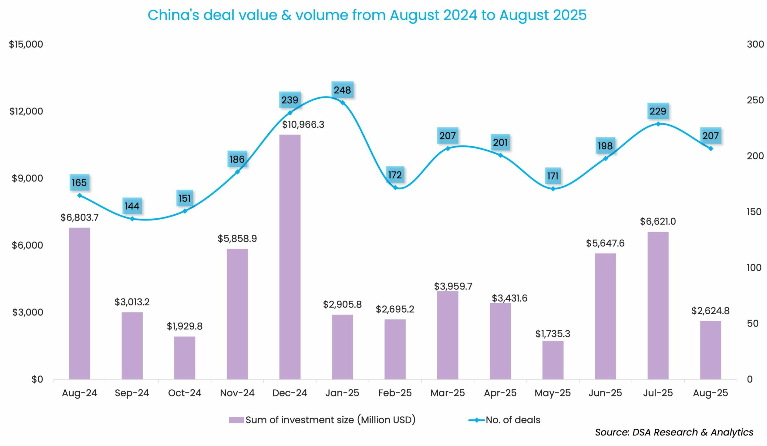 Investment activity in Greater China hit the brakes in August, with dealmaking plunging to its slowest pace in three months. The market saw just 207 deals closed, totaling $2.6 billion, a stark 60.4% drop in value and a 9.6% decline in volume compared to July.