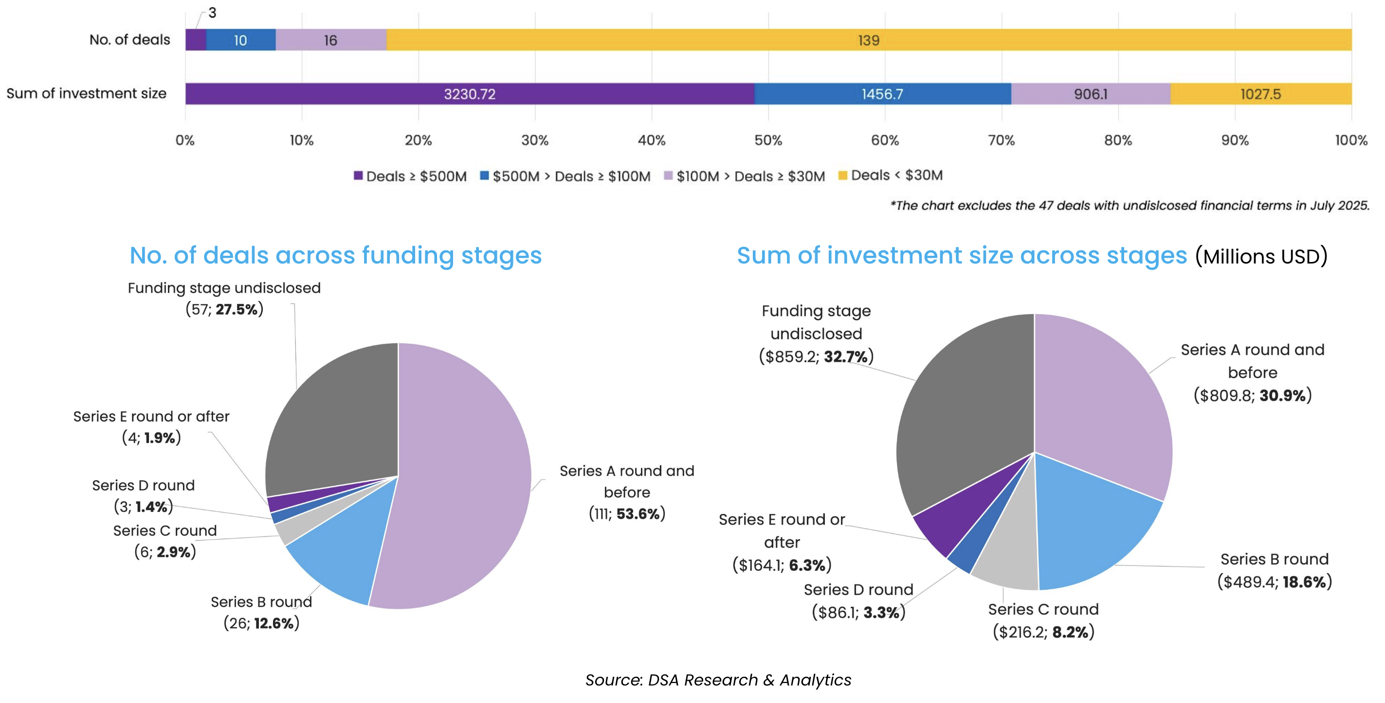 Early-stage investments dominated the funding scene. Series A and pre-Series A rounds accounted for 53.6% of the total deal count, clocking 30.9% of the deal value. Late-stage dealmaking saw a recovery with a total of four pre-IPO deals recorded in August.