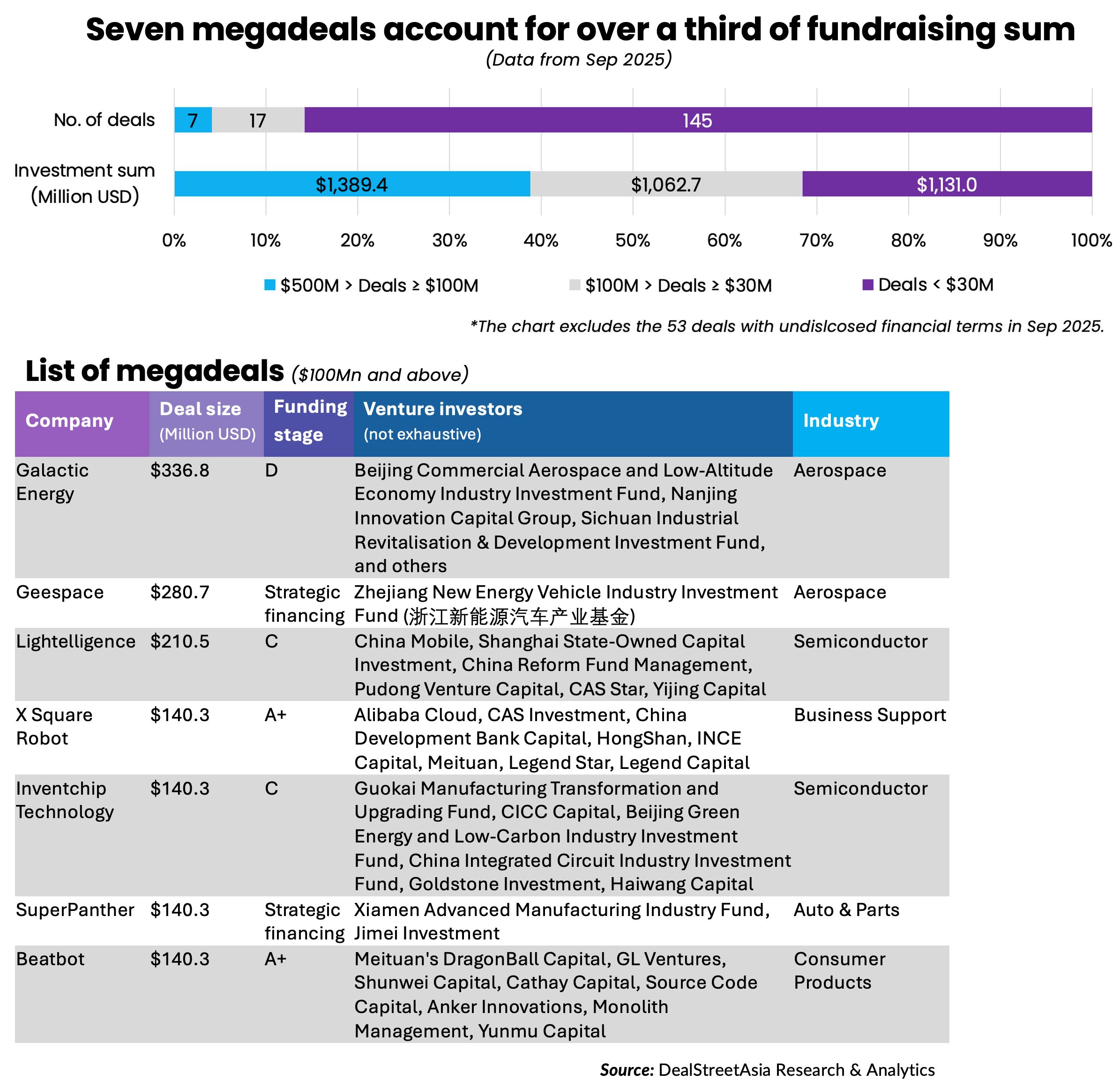 Besides the two biggest investments in commercial space companies Galactic Energy and Geespace, the remaining five megadeals happened across semiconductor, business support services (specifically, developers of robotics & drones primarily for commercial uses), and auto & parts.