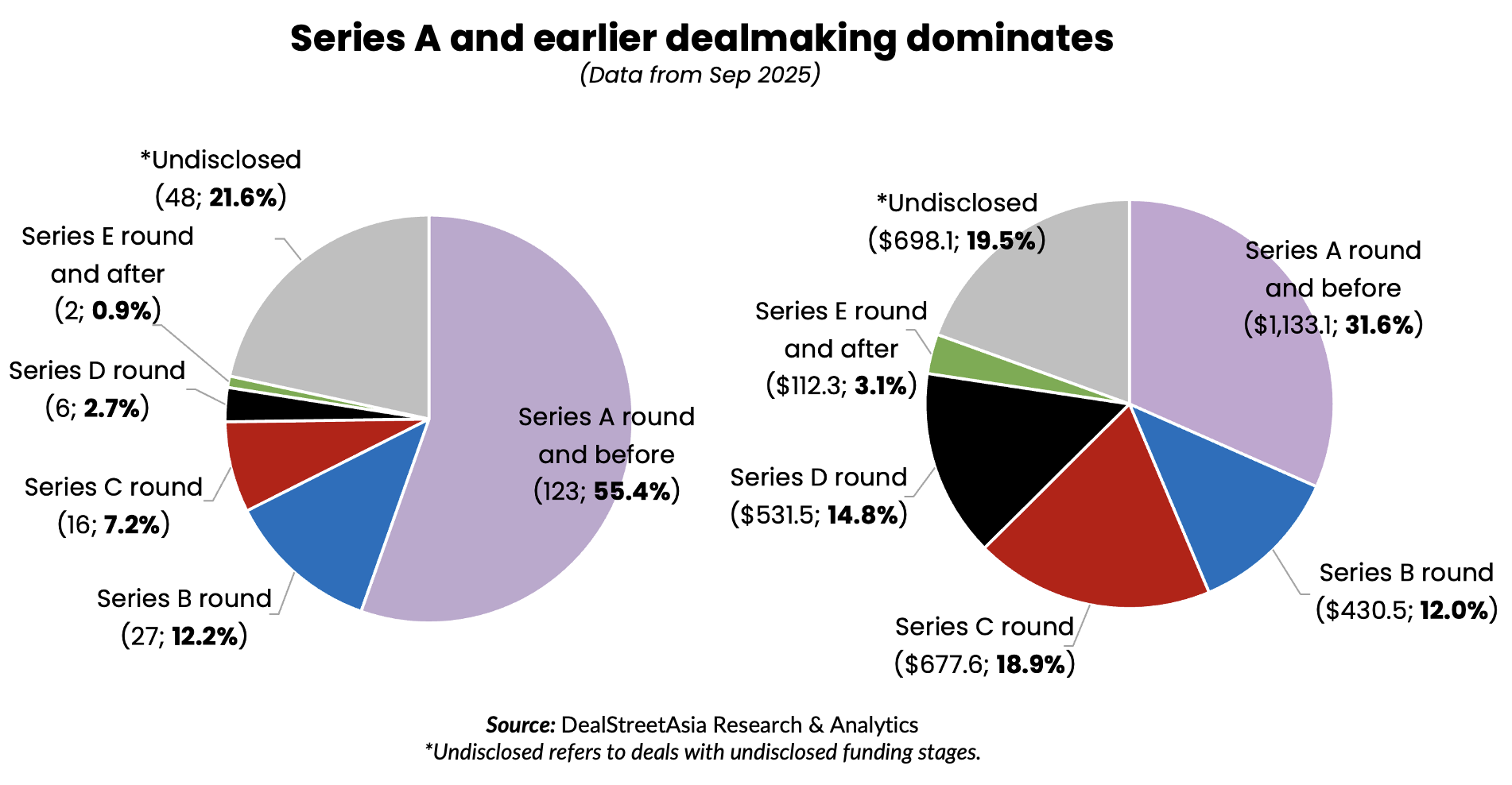 Across different funding stages, early-stage dealmaking at Series A round and before accounted for 55.4% of the overall deal count. At more than $1.1 billion, the fundraising sum at the Series A and earlier stage marked nearly a third of the month’s total.