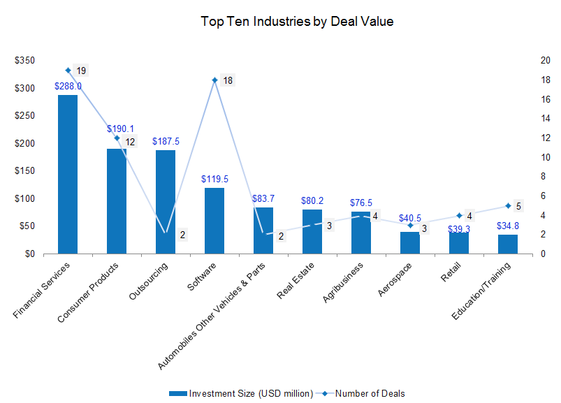 Two deals worth $187.5 million were closed within the outsourcing industry – Tredence ($175 million) and Uniqus Consultech Inc ($12.5 million).