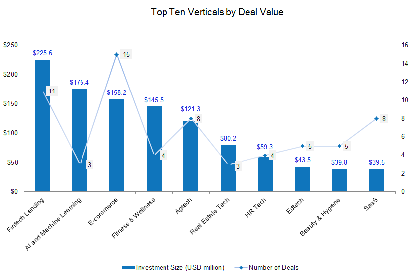 Within verticals, fintech lending ($225 million), artificial intelligence (AI) and machine learning ($175 million), and e-commerce ($158 million) were among the top scorers.
