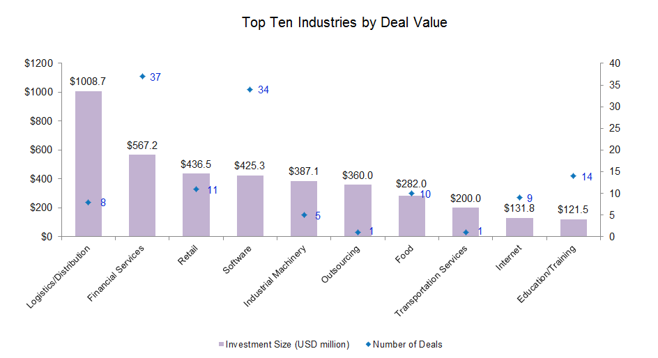 Together, the top three industries – logistics/distribution, financial services, and retail – garnered $2 billion, accounting for about 45% of the total value.
