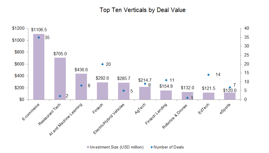 Retail occupied the third spot with $436 million funding across 11 deals, led by Udaan’s $250-million financing round via convertible note and debt. DealShare’s $130-million financing was another big deal during the month, which saw participation from Tiger Global, Alpha Wave, and Kora Investment.