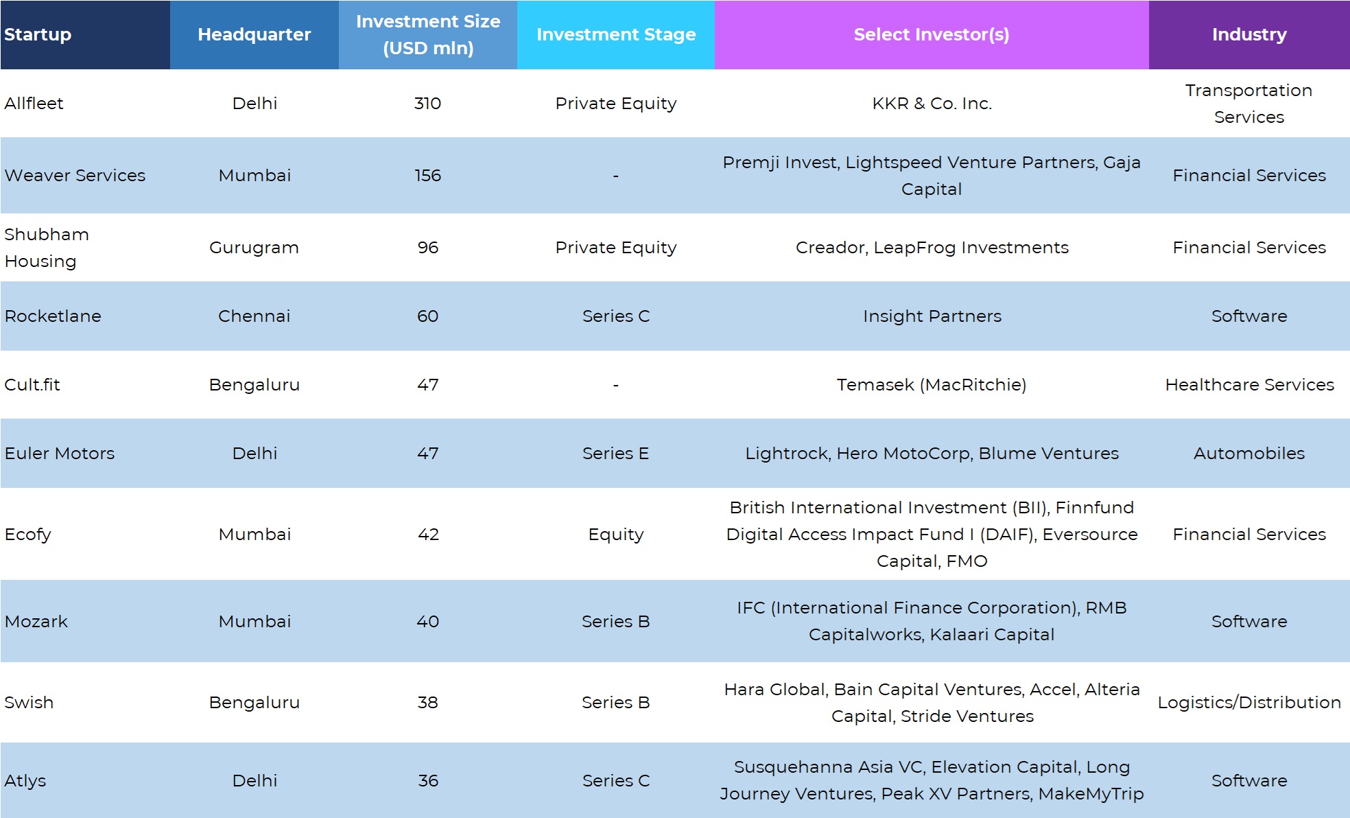 Other prominent deals in the month included Shubham Housing ($96 million), Rocketlane ($60 million), Cult.fit ($47 million), Euler Motors ($47 million), and Ecofy ($42 million).