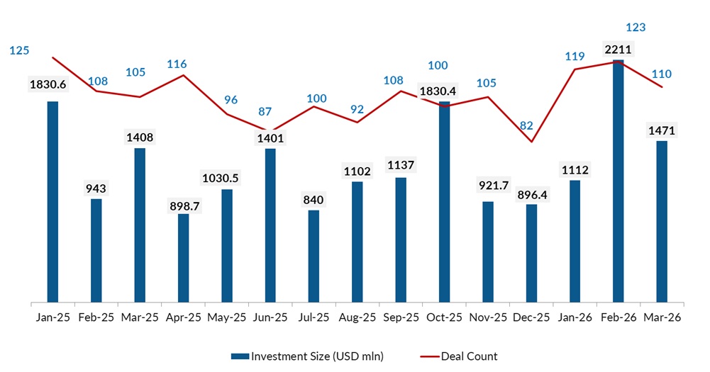 Funding halved to $1.47 billion across 110 deals in March 2026, from $2.21 billion across 123 deals in February, with the earlier surge largely driven by Neysa’s $1.2-billion fundraise, according to proprietary data compiled by DealStreetAsia.