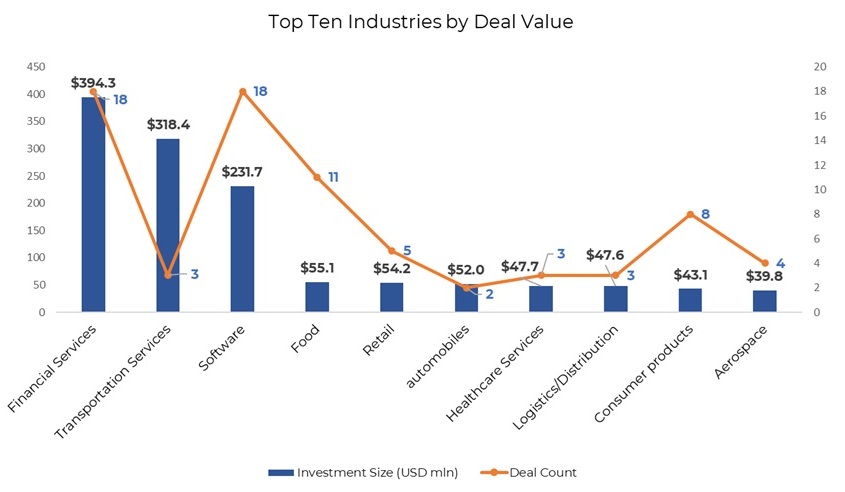 Together, the three industries—financial services, transportation services, and software—raised $944 million or 64% of the total deal value.