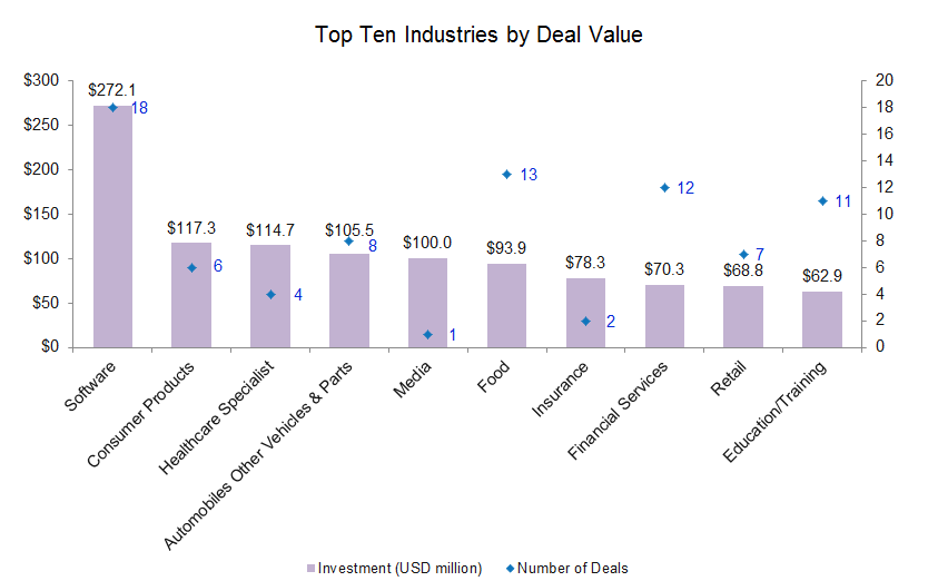 Together the top three industries – software, consumer products and healthcare specialist raised a total of $504 million, accounting for about 40% of the deal value in November.