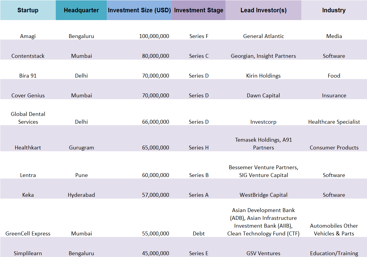 Amagi, Contentstack, Bira 91, Cover Genius, Global Dental Services, and Healthkart were among the startups that raised growth rounds in the month.
