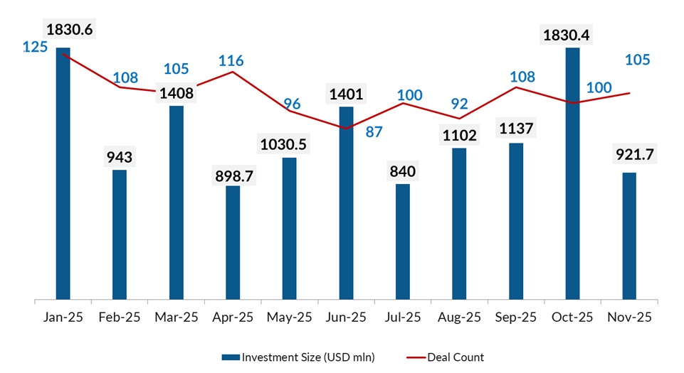 On a year-on-year basis, the funding value fell 44.4% in November 2025 from $1.65 billion across 91 deals in November 2024.