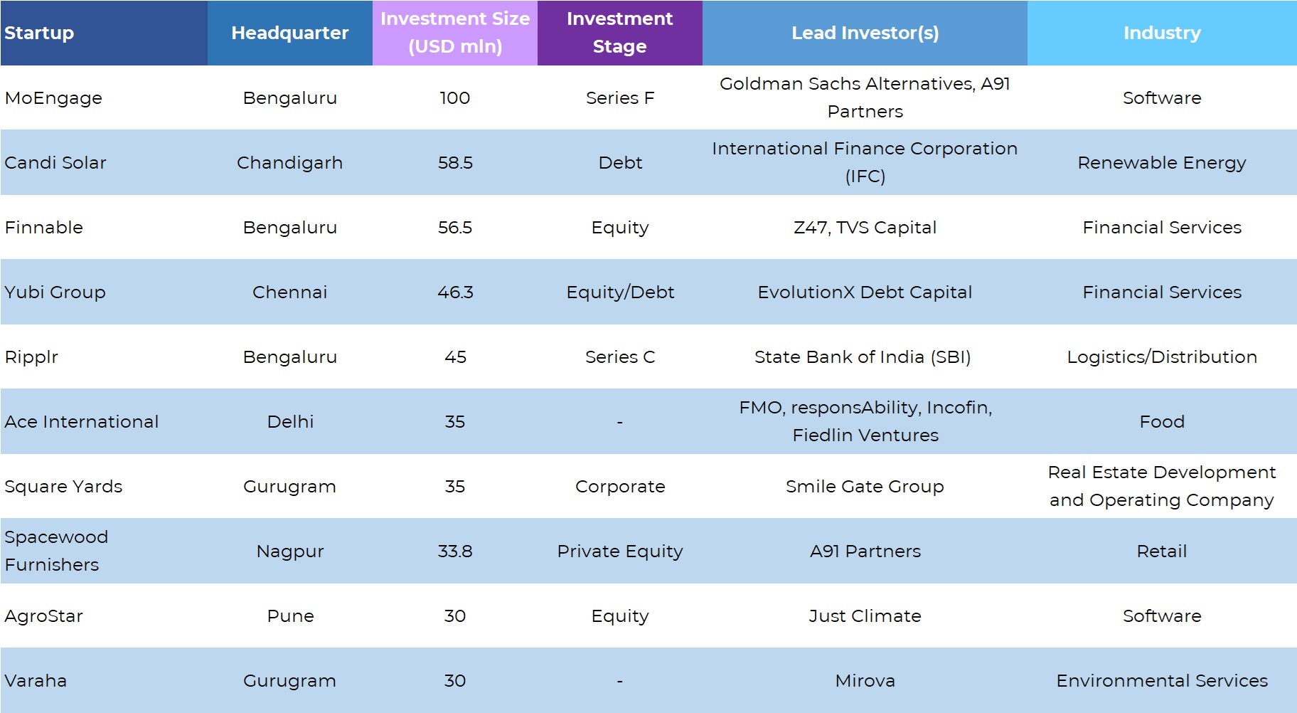 Other notable deals in the month included Candi Solar, a solar power solution provider for commercial and industrial clients, that secured $58.5 million in debt funding; digital lending platform Finnable that raised nearly $56.5 million in equity funding; fintech platform Yubi Group raised around $46.3 million; and Ripplr, a technology driven distribution and supply chain platform, which raised $45 million in its Series C funding round.