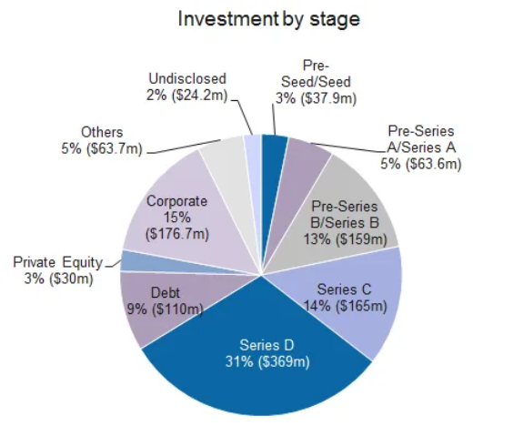 Growth-stage deals (including private equity rounds) led funding with a share of about 58% of the total deal value in September. Companies in the Series B or post-Series B rounds collected an aggregate of $697 million through 18 investments in the month compared with an aggregate of $280 million raised last month across three transactions.