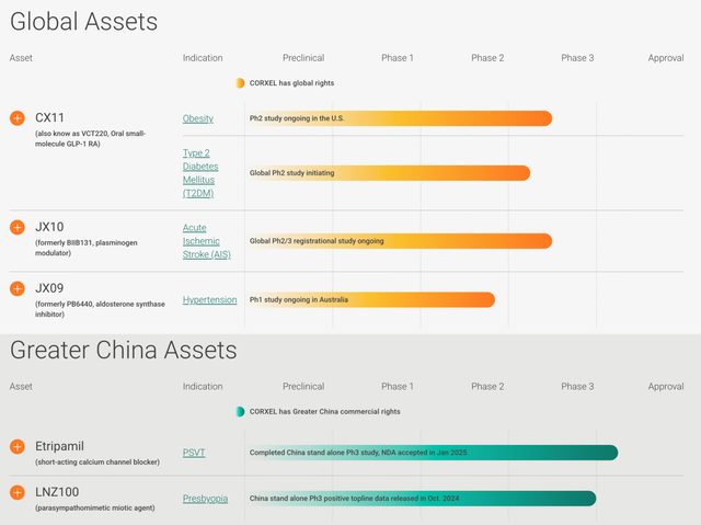 Besides CX11, Corxel is also developing selective small molecule compounds across the cardiometabolic spectrum, including JX10, a thrombolytic and anti-inflammatory agent for acute ischemic stroke, and JX09, a highly selective aldosterone synthase inhibitor for hypertension. It also has additional small-molecule programmes in development focusing on validated obesity targets.