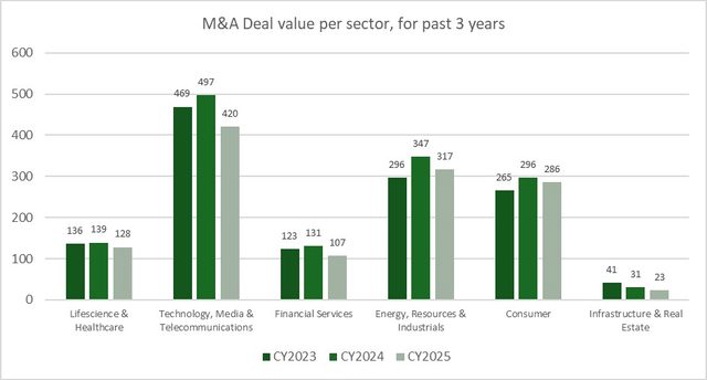 Sector-specific patterns highlight the evolving nature of deal activity. Per Deloitte research, the Technology, Media & Telecommunications (TMT) sector continues to lead in volume, with over 420 deals in CY2025. This growth is driven by strong demand in cloud, cybersecurity, AI engineering and digital infrastructure services.